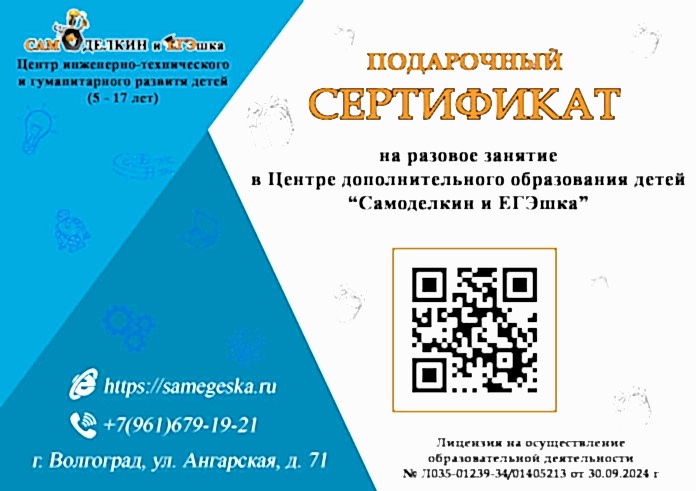 Pin-Up сертификат на одно бесплатное занятие на любой курс в Центре "Самоделкин и ЕГЭшка"
